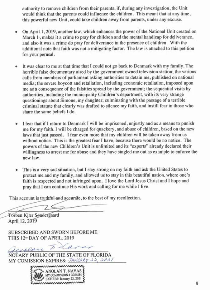 Torben submits a sworn affidavit requesting for asylum in the U.S.